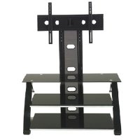 Mount a flat-panel plasma or LCD television in style on this attractive, sturdy TV stand from the innovative minds at Z-Line Designs. Designed for 60-inch screens or smaller, the TV stand’s integrated mount sustains televisions with up to a 150-pound weight capacity. The TV stand features a strong metal frame with black powder coat finish. Users can adjust the angle of the screen for optimum viewing with the stand’s swivel mount. For holding DVD/BluRay players, video game systems, stereo, and more, the TV stand provides three shelves. The shelves’ open air design allows air to circulate around the electronic components to increase safety. Crafted in 8mm and 6mm black tempered safety glass, chrome cylinder supports endow the shelves with extra stability. Installed slots in the TV stand enable tidy cable management. For home assembly, the TV stand comes equipped with a universal hardware mounting kit and detailed instructions. The user can mount the screen at varying heights to best meet their personal home entertainment needs. Made in China, this item is covered by a limited lifetime warranty. The assembled TV stand measures 44 inches wide by 21-1/4 inches deep by 50 inches high and weighs 101-3/4 pounds.